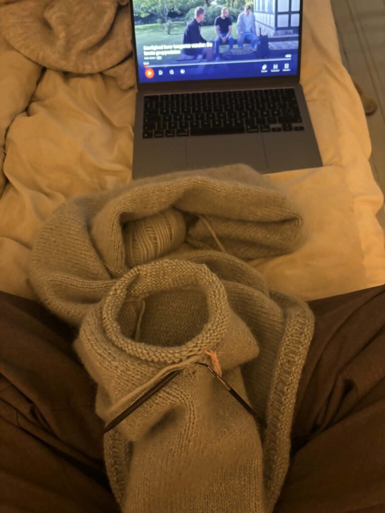 Efter en lang dag strikkede jeg mens jeg så “Kærlighed hvor kragerne vender”, hvor jeg kan koble hjernen helt fra og slappe af.